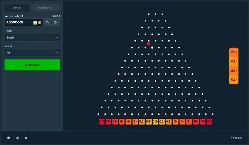 Plinko is a fast, physics-based arcade game popular in crypto casinos and instant-win lobbies. In this plinko demo, you set your risk level, choose the number of rows, pick a bet size, and drop balls through a pegboard toward multiplier cups. The appeal is instant: transparent odds, rapid rounds, and the thrill of riding a ball into a high-value pocket.