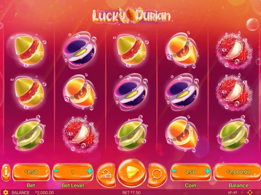 Lucky Durian places you among vibrant exotic fruits with a twist — the wild symbol is a durian fruit which, when it appears in a winning combination, expands to fill the entire reel. This expansion triggers the locked re-spin feature: once activated, the expanded wild remains in place and the remaining reels spin for up to three re-spins. The game uses classic fruit-slot visuals but with modern mechanics, delivering a blend of nostalgia and feature gameplay.